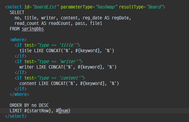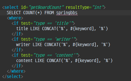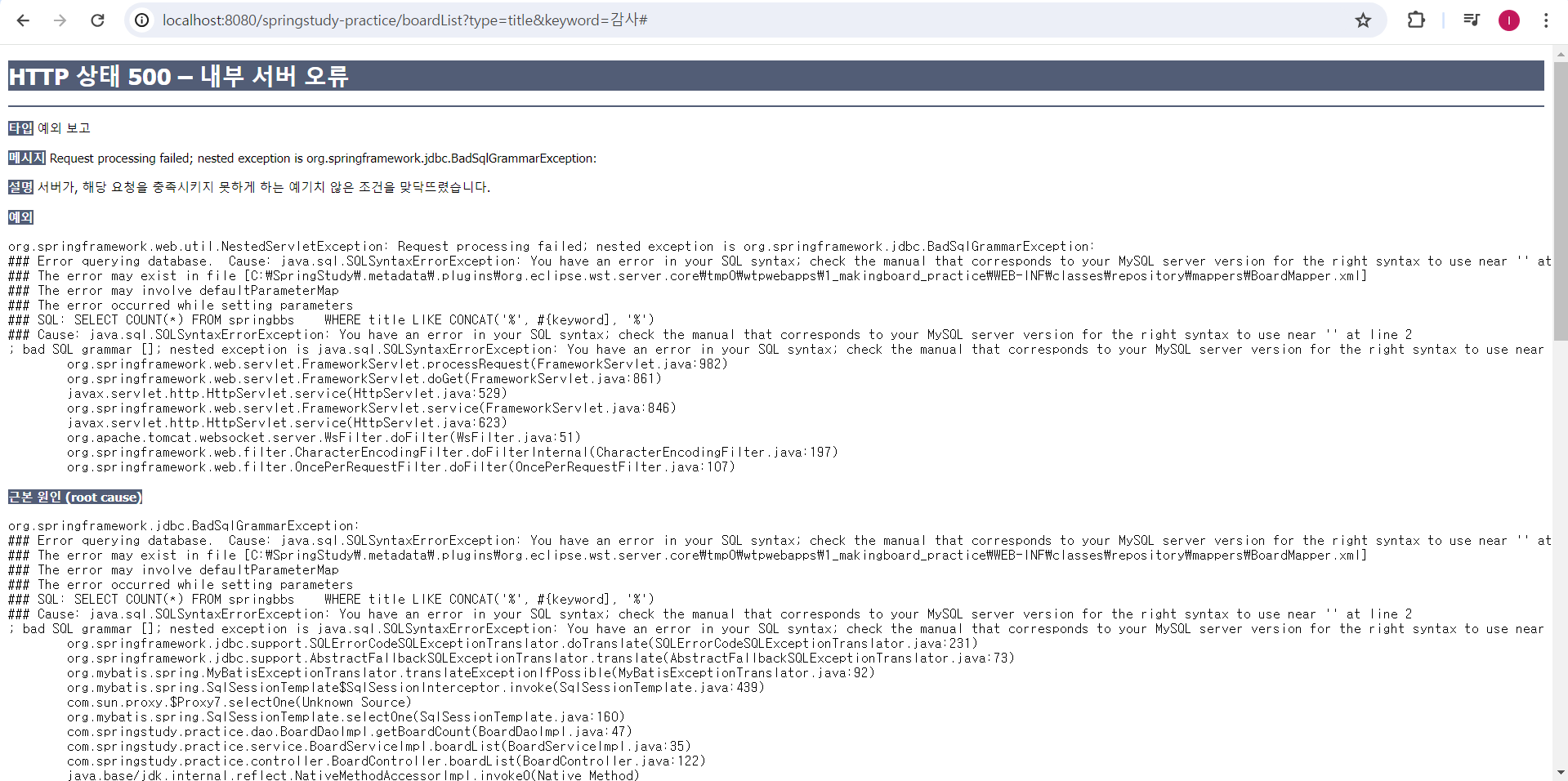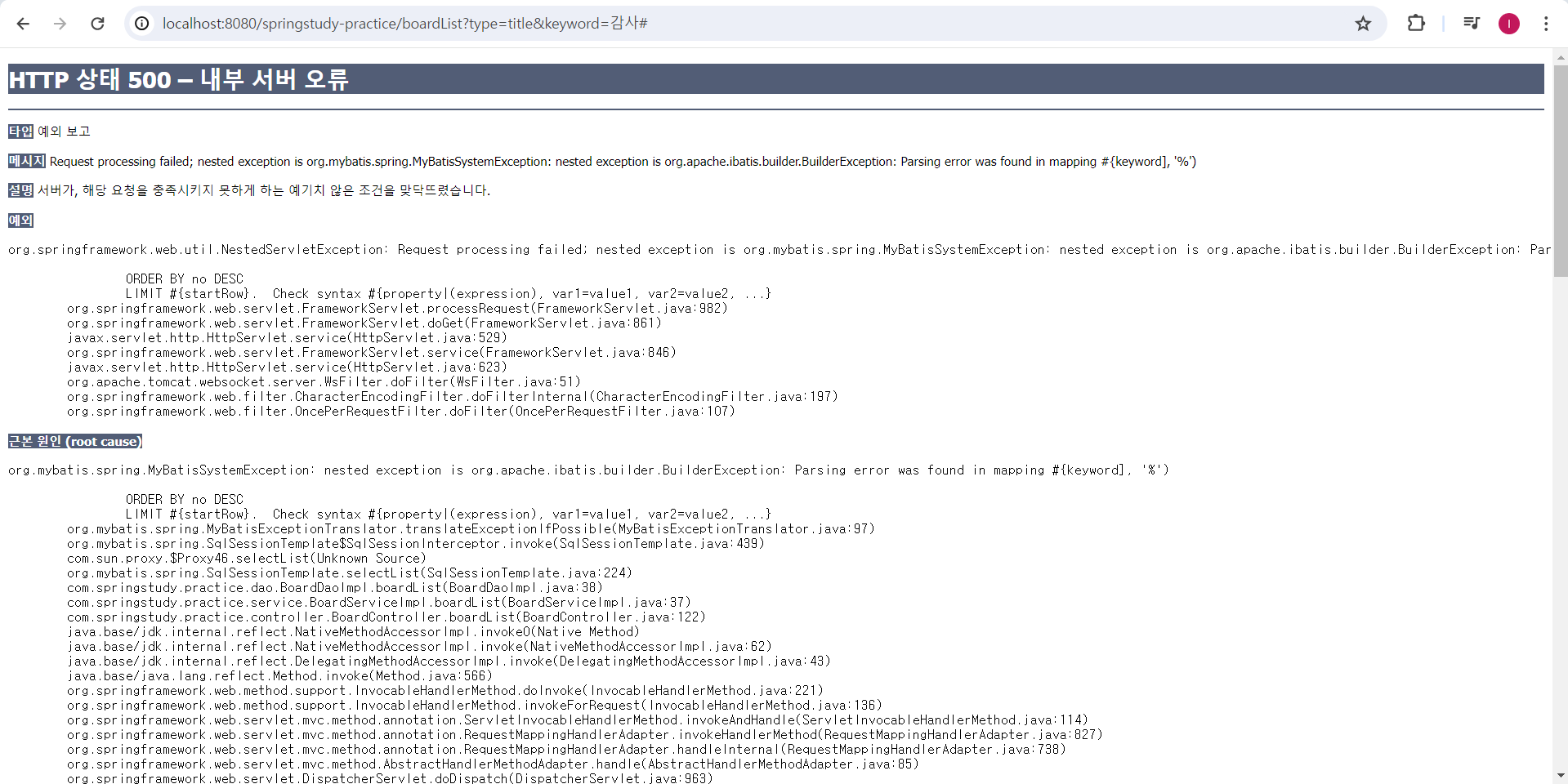 #{keyword]에서 } 대신 ]를 입력 한 오타 문제.