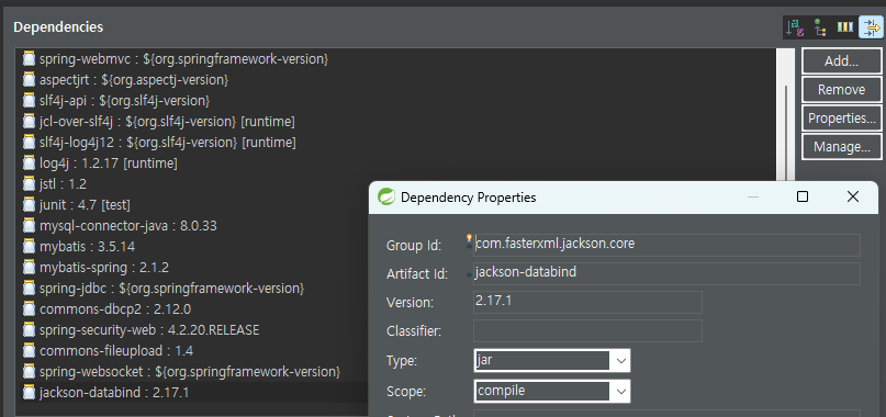 에러 메세지는 여러가지 뜨지만 딱 보니까 properties에 jackson.version을 만들지 않고 무지성으로 클론코딩 하다보니 생긴 문제인 것 같다. 이런 일이 발생하고 해결하면서 배울 수 있는 덕분에 클론코딩이 의미가 있는 것 같다.